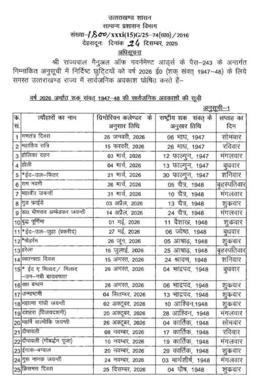 उत्तराखंड शासन के सामान्य प्रशासन विभाग ने वर्ष 2026 के लिए सार्वजनिक अवकाशों की वार्षिक सूची जारी कर दी है। शासन द्वारा जारी कैलेंडर के अनुसार नए साल में कुल 68 सरकारी अवकाश घोषित किए गए हैं, जिनमें से 07 अवकाश रविवार के दिन पड़ रहे हैं।