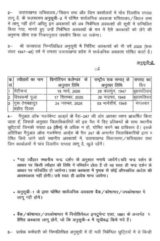 अनुसूची-2 में 03 अवकाश निर्धारित किए गए हैं, जिनका लाभ पांच दिवसीय कार्य प्रणाली वाले कार्यालयों को नहीं मिलेगा।