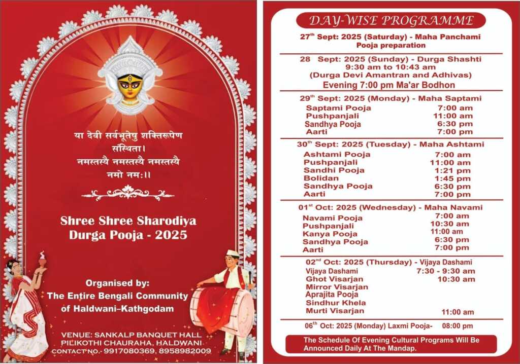 हल्द्वानी। शहर के बंगाली समुदाय ने आज अपने पारंपरिक पाँच दिवसीय दुर्गा पूजा महोत्सव का भव्य शुभारंभ किया। इस शुभ अवसर पर आज महापंचमी की पूजा के साथ ही पूजा का समापन हुआ, जिसमें श्रद्धालुजनों ने माँ दुर्गा की पूजा-अर्चना और महाआरती के माध्यम से अपनी श्रद्धा सुमन अर्पित किए।
