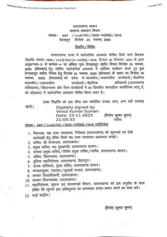 पहले यह सार्वजनिक अवकाश 24 नवंबर (सोमवार)को घोषित किया गया था, लेकिन नई संशोधित अधिसूचना के अनुसार अब यह अवकाश 25 नवंबर 2025 (मंगलवार) को होगा।