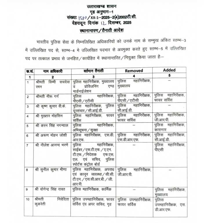 उत्तराखंड में पुलिस महकमे में एक बार फिर बड़ा प्रशासनिक बदलाव किया गया है। शासन ने आईपीएस अधिकारियों के ट्रांसफर आदेश जारी किए हैं। जारी निर्देशों के अनुसार, अधिकारियों को उनके वर्तमान पदों से अवमुक्त करते हुए जनहित एवं कार्यहित में नए पदों पर तत्काल प्रभाव से नियुक्त किया गया है।