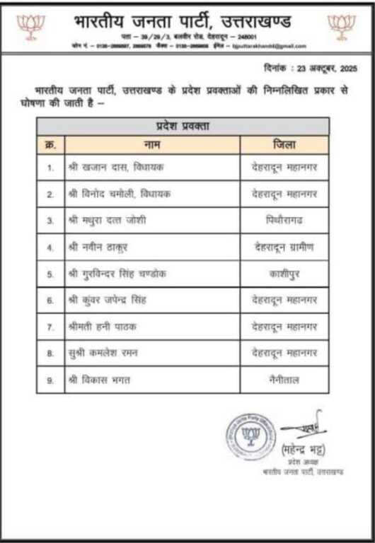 देहरादून। भारतीय जनता पार्टी उत्तराखंड ने प्रदेश प्रवक्ताओं की नई सूची जारी कर दी है। प्रदेश मीडिया प्रभारी मनवीर सिंह चौहान ने जानकारी देते हुए बताया कि यह घोषणा प्रदेश अध्यक्ष महेंद्र भट्ट के निर्देश पर की गई है। पार्टी ने प्रदेश स्तर पर कुल 9 प्रवक्ताओं की नियुक्ति की है।